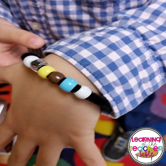 One of the highlights of weather week was making a Water Cycle Bracelet! After reading about rain and the water cycle, we took colored pony beads and sequenced them in order on a pipe cleaner to demonstrate the Water Cycle. You could also use yarn for the bracelets.
