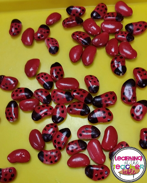 By the way, I spray painted the whole bag so I would have plenty of counters for my class and I wouldn't worry if we lost a couple along the way. I have actually sent home baggies of ladybug bean counters with students who needed a little extra practice counting sets. Students love when I tell them they get to keep the ladybugs, too. So having extra ladybug counters is always beneficial!