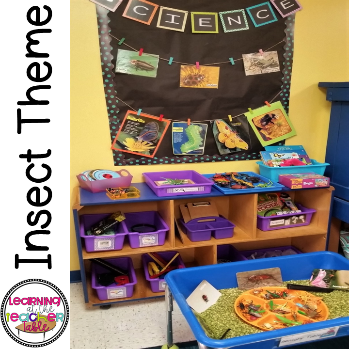 The sensory table has dried green peas as a filler and lots of cute little plastic creatures. I added a tray so the kids can sort insects and get a fine motor workout with the tongs. There's a set of sturdy cardboard flashcards in the tub, too. I love including these real photographs for my students.
